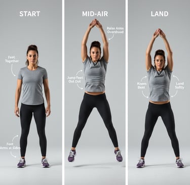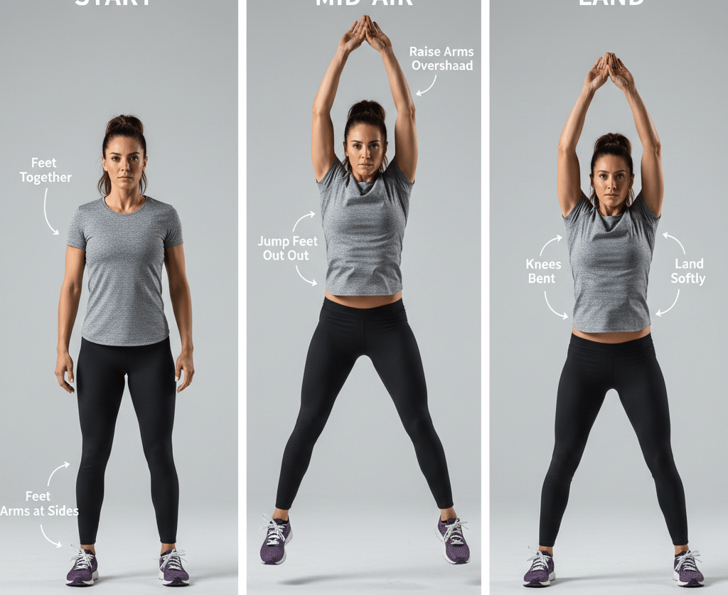 Jumping jacks are a classic warm-up exercise that gets your heart pumping and muscles ready for movement. Stand tall with your feet together and arms at your sides. Jump while spreading your legs apart and raising your arms overhead, then return to the starting position. This simple move improves cardiovascular health, coordination, and stamina. Beginners can start with 20–30 repetitions and gradually increase as endurance builds.